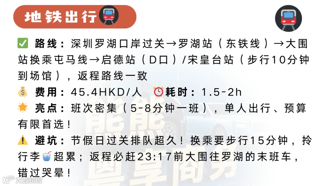 ✅ 路线:深圳罗湖口岸过关→罗湖站(东铁线)→大围站换乘屯马线→启德站(D口)/宋皇台站(步行10分钟到场馆),返程路线一致