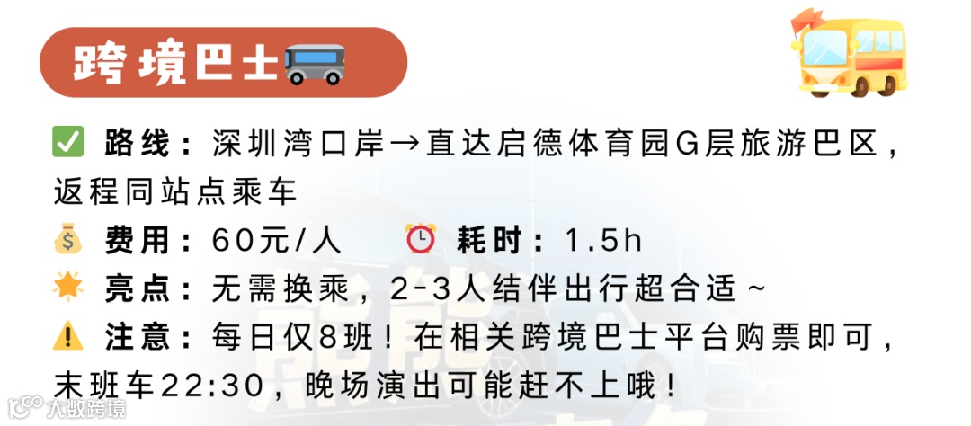 ⚠️ 注意:每日仅8班!在相关跨境巴士平台购票即可,末班车22:30,晚场演出可能赶不上哦!