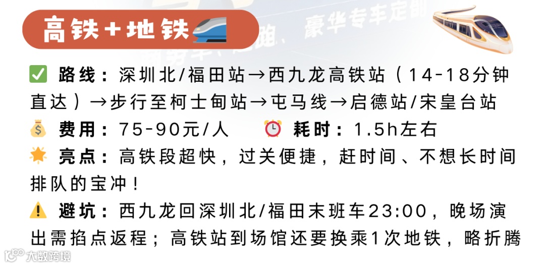 🌟 亮点:高铁段超快,过关便捷,赶时间、不想长时间排队的宝冲!