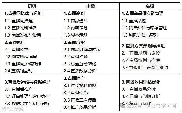初级——重点考核直播平台操作、直播执行和初步的数据分析能力;匹配从事直播助理、运营助理等岗位的工作需求,如直播间搭建与运维、直播执行、直播后运维与数据整理等工作。