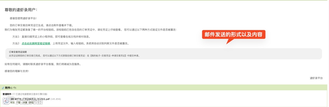 我们采用PDF文档格式,并为每张回单添加了唯一的校验码和用户ID水印,确保回单的真实性和防篡改性。