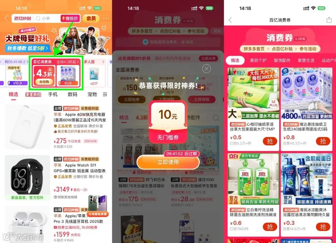 拼多多APP首页“百亿补贴”->百亿消费券->抽10亓无门槛券,有很多几毛包邮的大牌实物