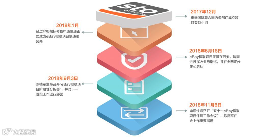 2018年1月,申通快递通过该项目物流供应商各项指标的严格考核,以优质,高效的服务方案获得合作方认可,从多家竞争对手中脱颖而出,正式成为eBay橙联项目的快递服务商,全程为eBay橙联项目提供国内快递寄递服务。