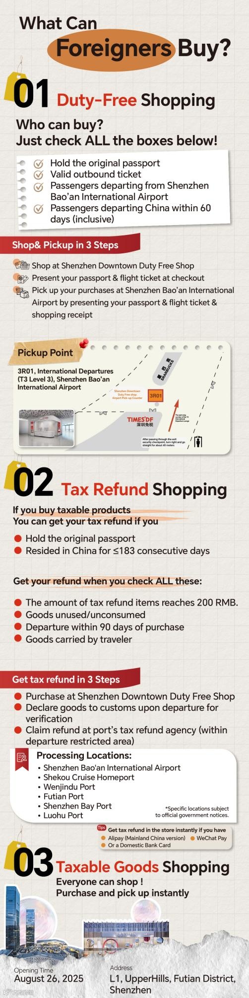 免税商品面向持60天内从深圳机场出境机票的游客,有税商品则面向所有人,其中购买有税商品满200元的港澳台同胞和外国人可以享受9%的离境退税优惠。(具体购物和提货流程参见文末)