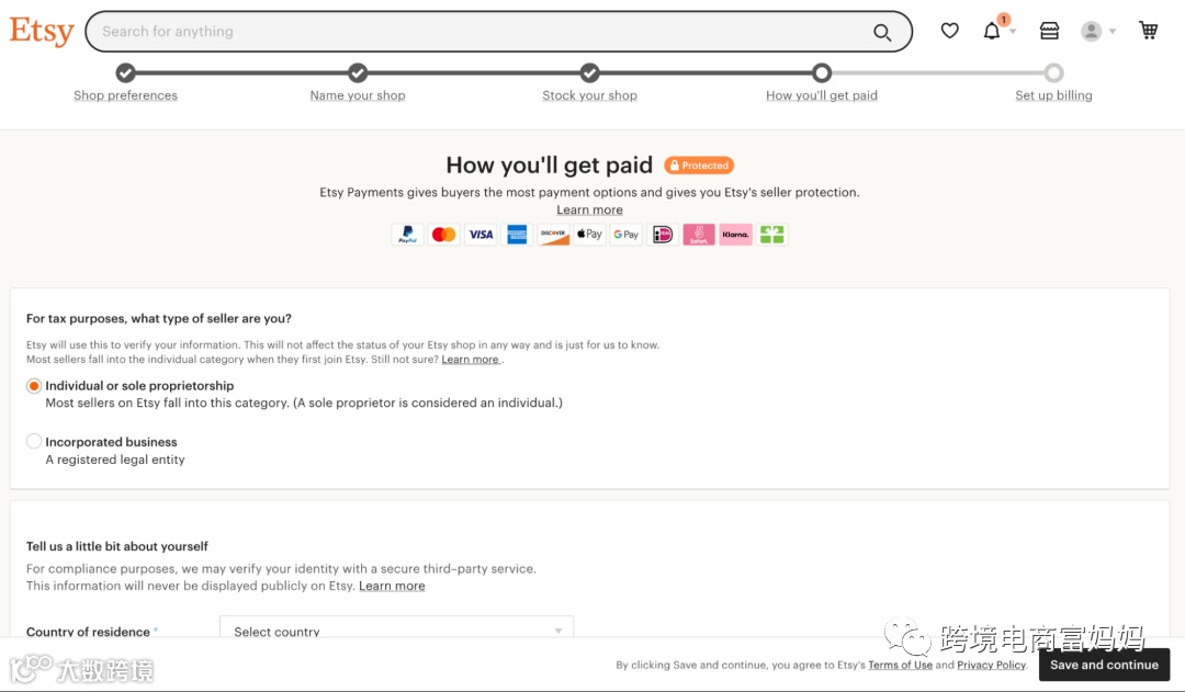 Etsy 需要知道纳税申报状态,因此它在付款设置下的第一个问题是你是个人、独资企业还是注册法人实体。 如果你选择“个人或独资企业”,需要提供所在的国家/地区、全名、出生日期、地址、电话号码和社会安全号码的最后四位数字。