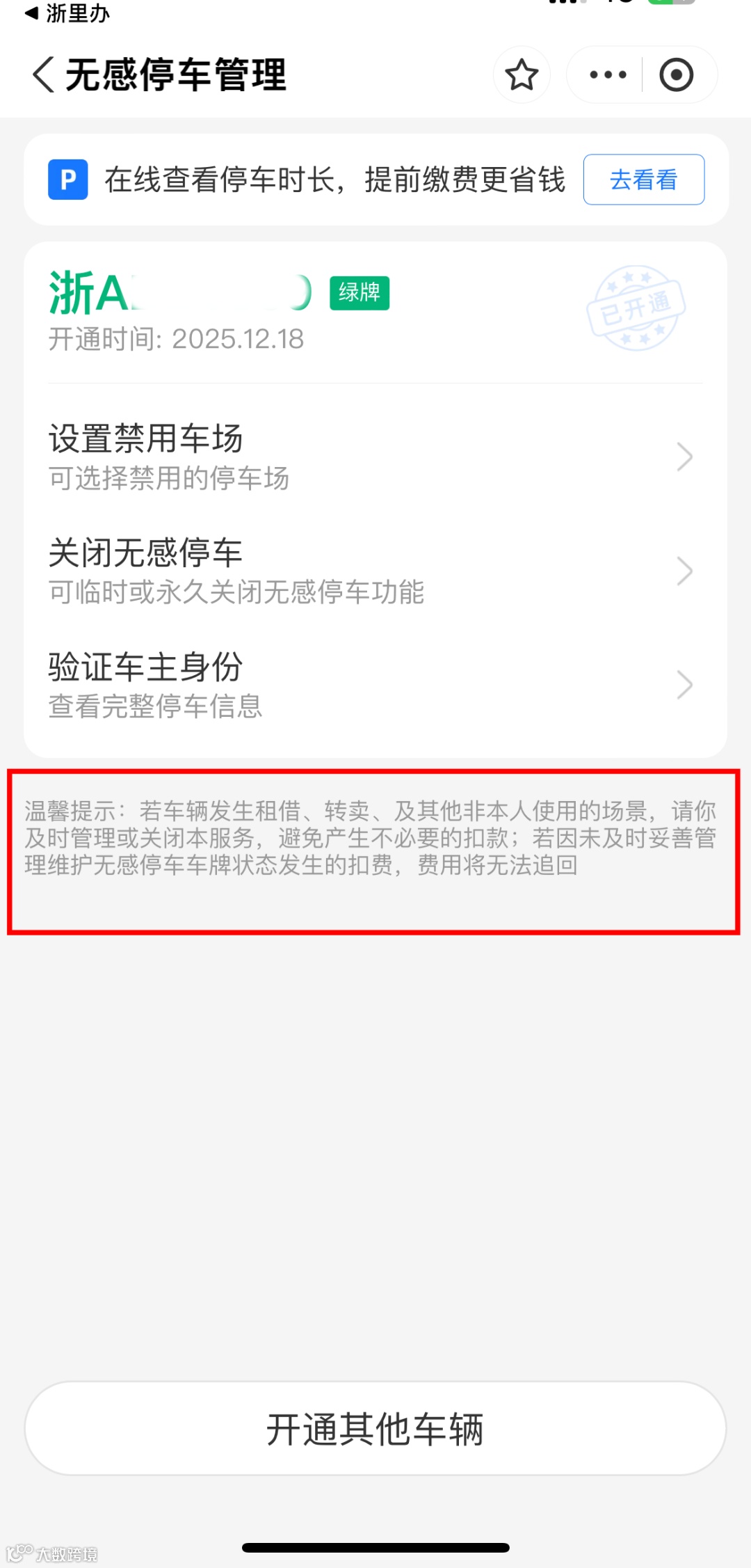 在开通“先离场后付费”功能后,若车辆发生租借、转卖、赠予、报废及其他非本人使用的场景,请务必及时关闭“先离场后付费”服务,避免产生不必要的损失。