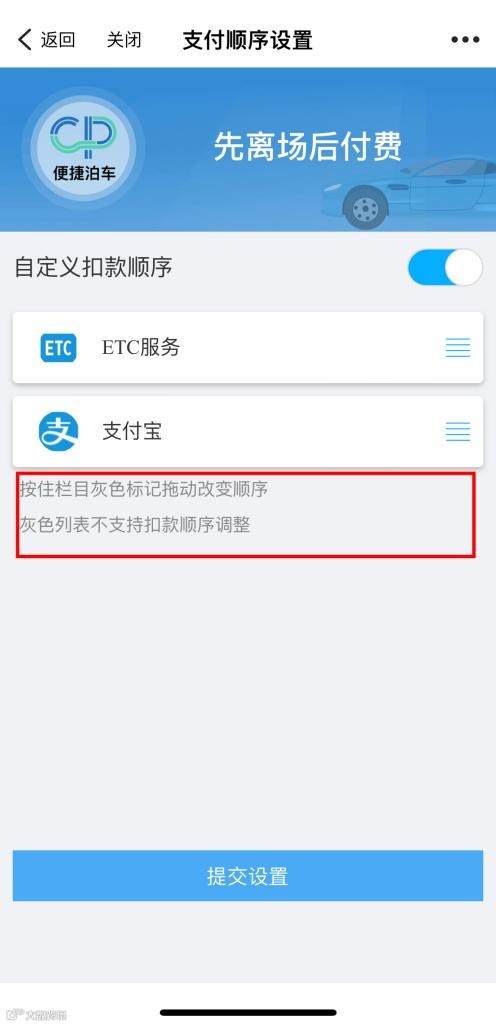 在开通功能后,如车主绑定了多种支付渠道,可设置支付顺序,支付时系统会按设定顺序尝试扣款,若当前优先方式余额不足或者支付失败,会尝试下一顺序的支付方式。