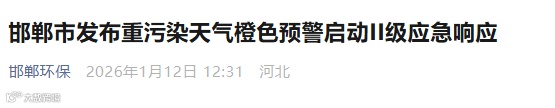根据省生态环境应急与重污染天气预警中心、中国环境监测总站、省气象灾害防御和环境气象中心联合会商,自1月12日起,邯郸市大气扩散条件转差,污染物持续累积叠加传输影响,可能出现中度及以上污染过程。市重污染天气应急指挥部决定2026年1月12日13时起,启动重污染天气Ⅱ级应急响应,预计1月17日左右解除。