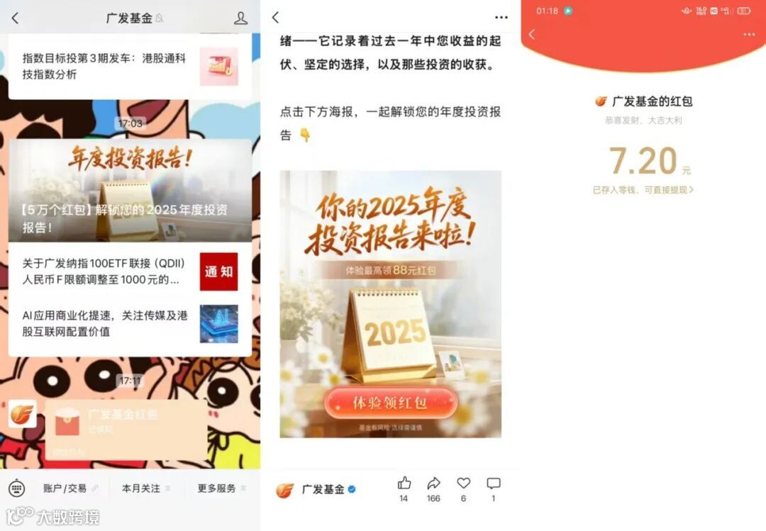 微信搜索公众号“广发基金”->历史信息->找到“年度报告”->点击体验领取红包->进入参加活动->需开H->才能抽红包->可以注销->亲测7元