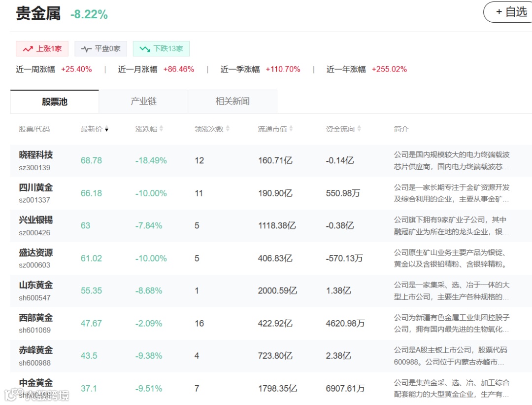早盘贵金属板块集体低开,中金黄金、白银有色、豫光金铅、招金黄金、四川黄金、湖南白银跌停,晓程科技低开超19%,山金国际、赤峰黄金、西部黄金等跌幅靠前。