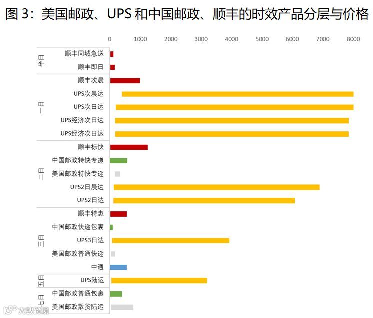 运输距离差异带来产品分层差异。UPS陆运快递时效「5日达」,与其空运「次晨达」产品价格相差8倍。时效与价格的巨大差距,使美国快递产品分层颗粒度大于中国。在中国,由于较短的运距与较高的居住密度,72%的快递可在72小时内完成投递 。这自然阻碍了快递产品的进一步的分层。中国就连航空运输在快递干线运输中的比例,也仅3% ,原因依然来自运距较小——800公里内,空运与陆运的时效差异不显著,成本却相差3倍。