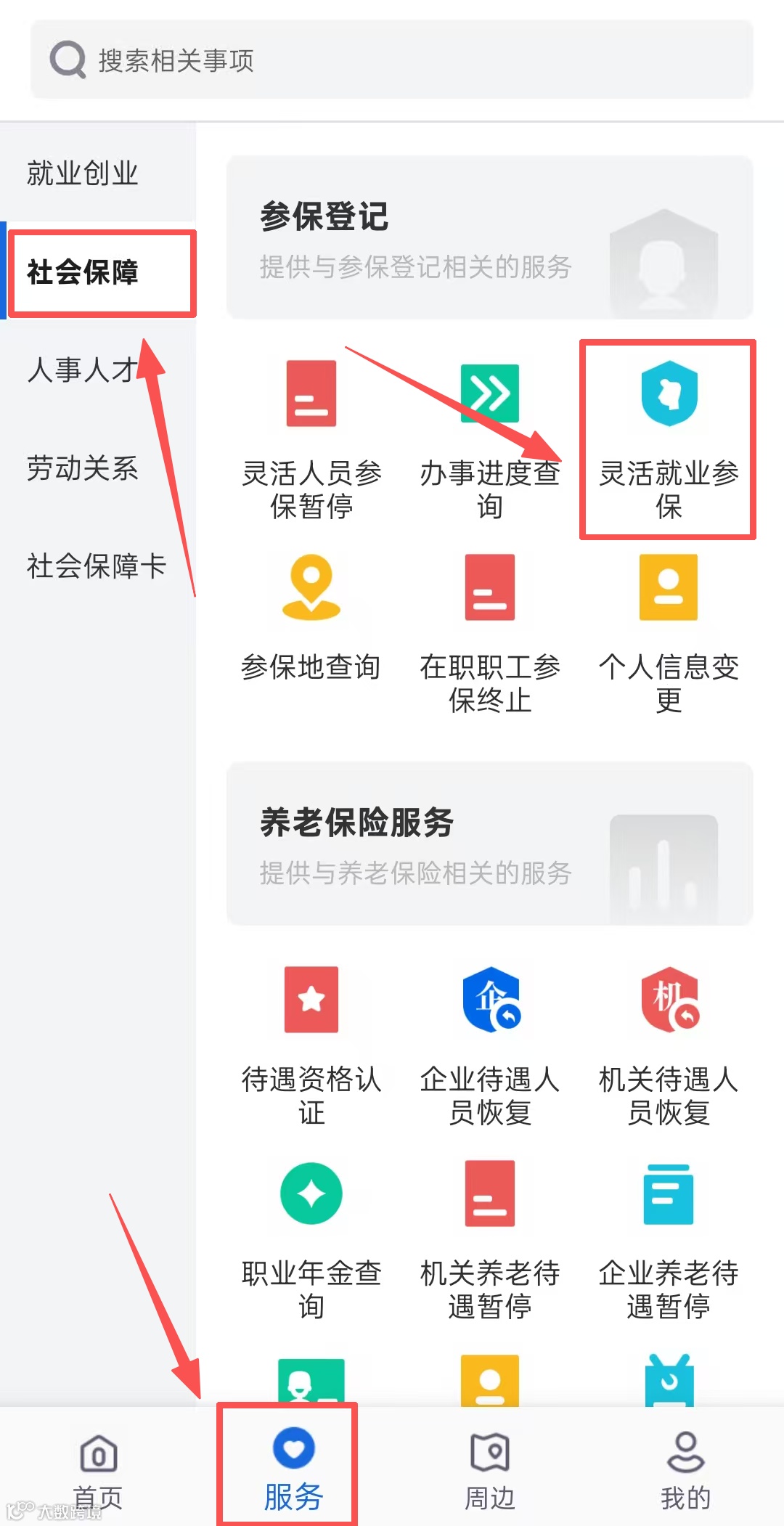 个人登录“河北人社”APP后,点击菜单栏“服务”>“社会保障”>“参保登记”>“灵活就业参保”办理;