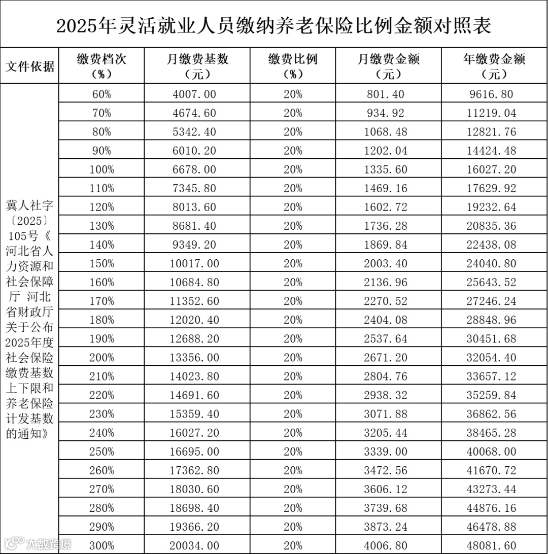 2025年全省社会保险(含职工基本养老保险、工伤保险、失业保险)缴费基数以6678元/月确定个人缴费基数上下限,缴费基数下限为4007元(60%),缴费基数上限为20034元(300%)。