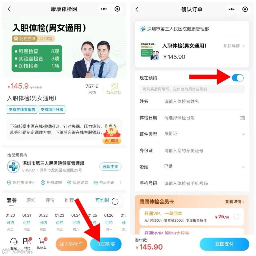 点击相应套餐右下角的【立即购买】,勾选【现在预约】按钮,填写体检人信息、体检日期等,立即支付,即可完成预约。