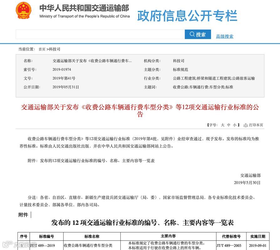 近日,交通运输部发布修订后的交通运输行业标准《收费公路车辆通行费车型分类》,进一步统一、规范和完善了全国收费公路车型分类,有力支持取消全国高速公路省界收费站,实现不停车快捷收费。