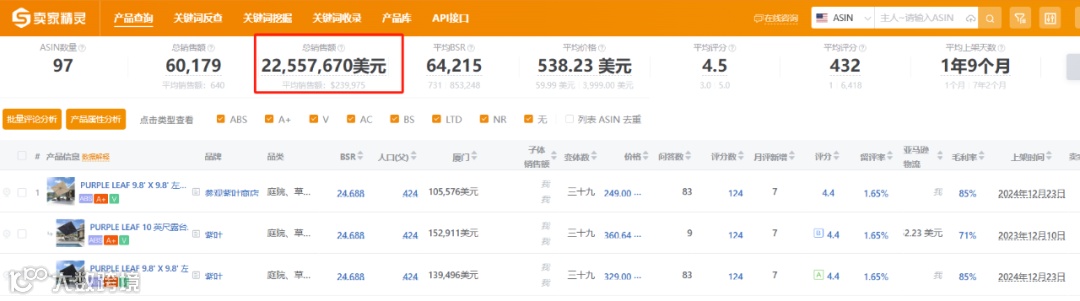 卖家精灵数据显示,自品牌入驻亚马逊后,总销售额达2255万美元(合人民币1.4亿)。