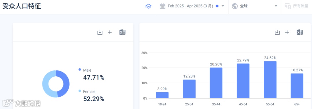 图源:simlarweb核心消费群体集中在35-64岁的中高收入人群,占比达67.51%。