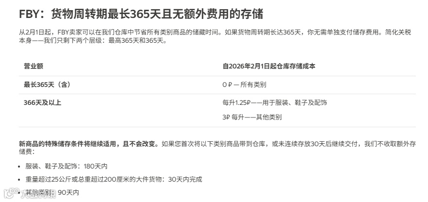 免费存储期:自2026年2月1日起,所有品类商品在仓库存储不超过365天(含)均免收仓储费。