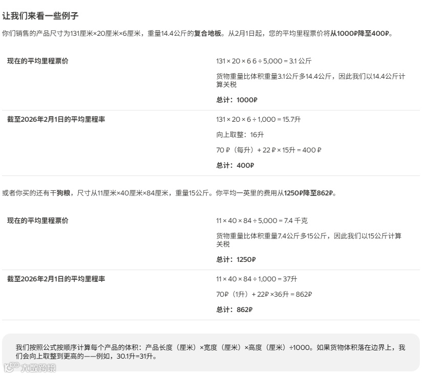 Yandex Market将FBY和FBS服务的平均里程费率计算方式从按重量或体积重量取大值,调整为按货物实际体积(升)计费,自2026年2月1日起生效。