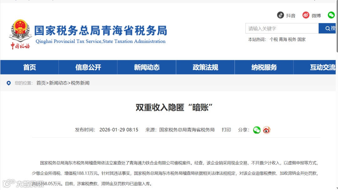 国家税务总局海东市税务局稽查局依法立案查处了青海通力铁合金有限公司偷税案件。经查,该企业销采用现金交易,不开票少计收入,以虚假申报等方式,少缴企业所得税、增值税188.13万元。针对其违法事实,国家税务总局海东市税务局稽查局依据相关法律法规规定,对该企业追缴税费款、加收滞纳金并处罚款,共计268.05万元。目前,涉案税费款、滞纳金及罚款均已追缴入库。