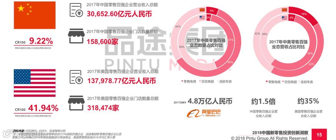 根据品途集团《2018年中国新零售投资创新洞察》报告,2017年中国零售百强企业的线下门店数量为158,600家,而美国这个数字达到了318,474,之间相差了近一倍,从中美的线下媒介(b)来看,依然存在着巨大的发展空间。