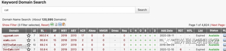 可按外链数量排序筛选,优先考虑外链多且刚过期的域名。例如搜索关键词“cat”,设置过滤条件为“available”及域名长度≤10字符的.com域名,系统将返回按外链数降序排列的结果。