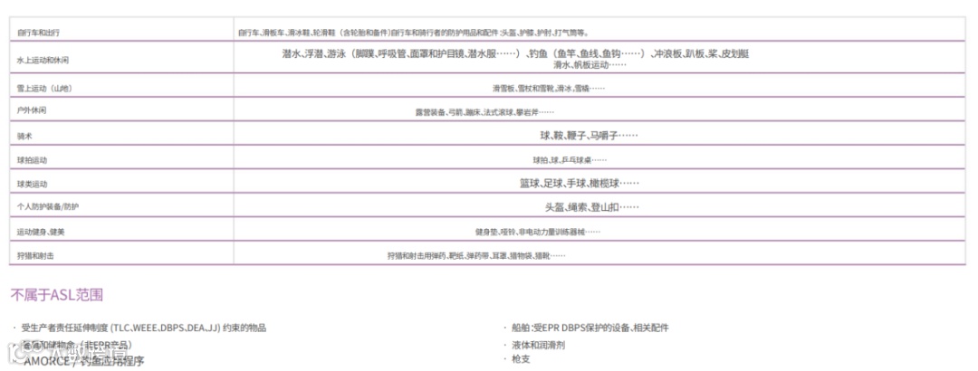 根据法国《环境法典》R543-330条规定,“体育和休闲用品”指用于体育或户外休闲活动的设备及其配件和消耗品,包括: