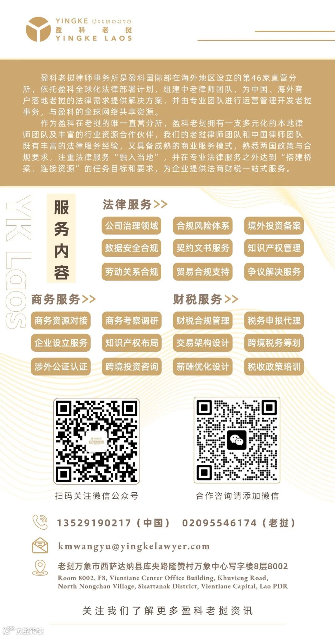 盈科老挝秉持专业、高效、务实的服务理念,依托盈科全球法律服务网络,立足老挝本土市场,持续为中资企业出海提供全方位、定制化的法律与商业解决方案,助力构建中老经贸合作桥梁。