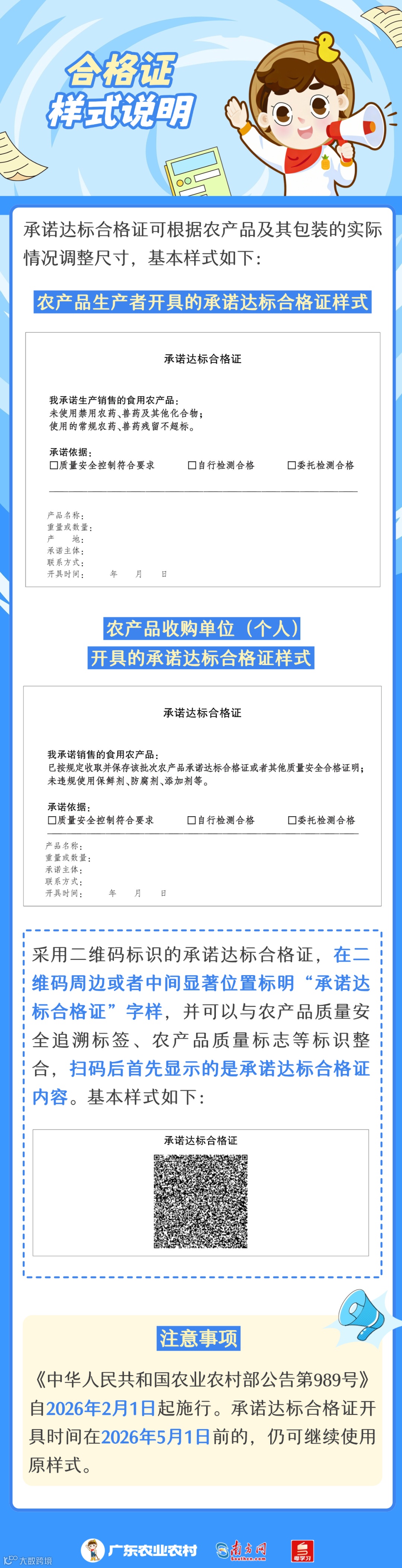 2025年12月2日,农业农村部发布《农产品质量安全承诺达标合格证管理办法》(农业农村部令2025年第4号),该办法将于2026年2月1日起施行。近日,农业农村部同步公告了承诺达标合格证的具体样式,标志着农产品质量安全监管再升级。