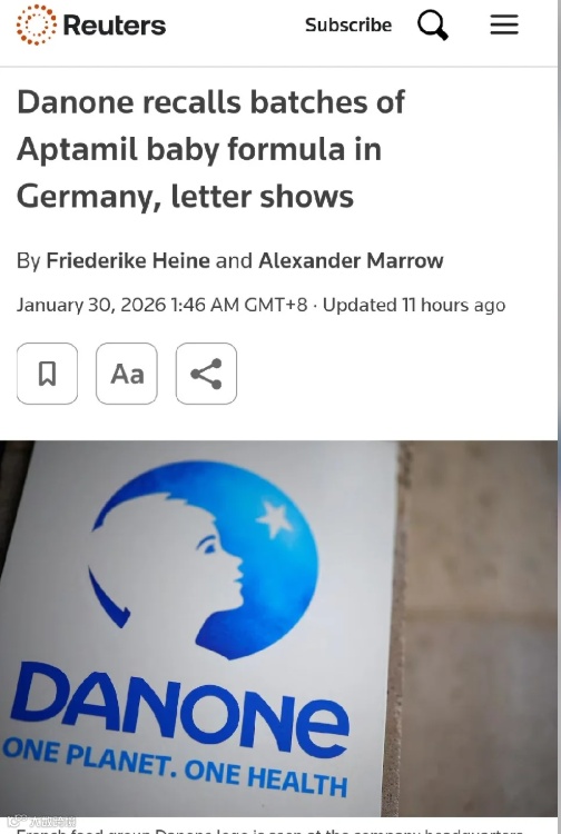 1月30日多家德国权威媒体已报道确认:达能(Danone)在德国对部分 Aptamil(爱他美)奶粉批次开始启动召回。
