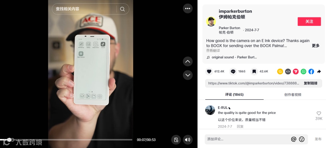 如TikTok一科技类头部博主anjmejia选择口播的方式,来对产品进行了实际使用的展示,这条视频获得了15.6万次点赞以及1000多条评论。另一TikTok区安卓数码博主imparkerburton Parker Burton也是用“口播+现场使用展示”的方式,收获了61.2万点赞、1800多条评论。