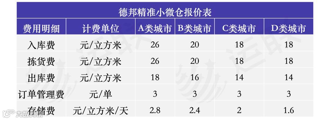 德邦微仓以自身强大的物流背景,提供从入库、拣货、管理、出库等一系列仓储服务,按立方进行收费。据了解,现今德邦微仓已在全国60个城市设立了100座仓库,总面积超过100万平方米;其客户涉及家电、酒类、化妆品、汽配、保健品、食品、3C数码等电商企业。