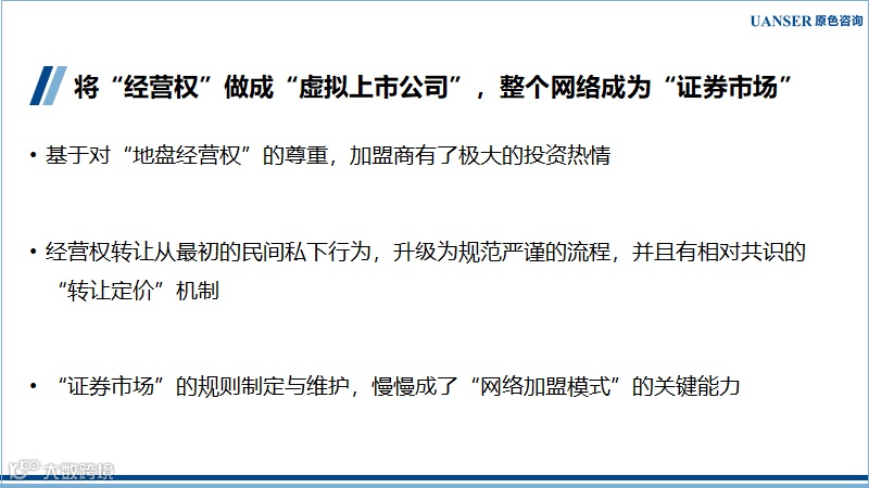 对于一个证券市场而言,为了吸引更好的投资标的以及更多的投资者,公开透明以及有利于企业健康成长的规则,至关重要。所有网络加盟模式的总部职能,都是在制定和维护规则,很多时候称之为「政策」。而政策制定者的水平,几乎决定了同等规模下两个加盟网络的经营表现。