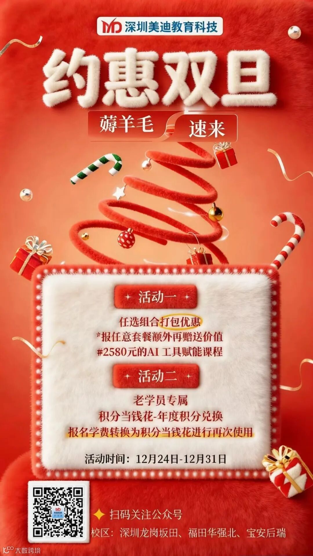 🎄当圣诞的铃铛撞上元旦的钟声,深圳美迪教育「约惠双旦」福利重磅上线,两大惊喜福利直接拉满,帮你把电商学习的羊毛薅到底!🔔