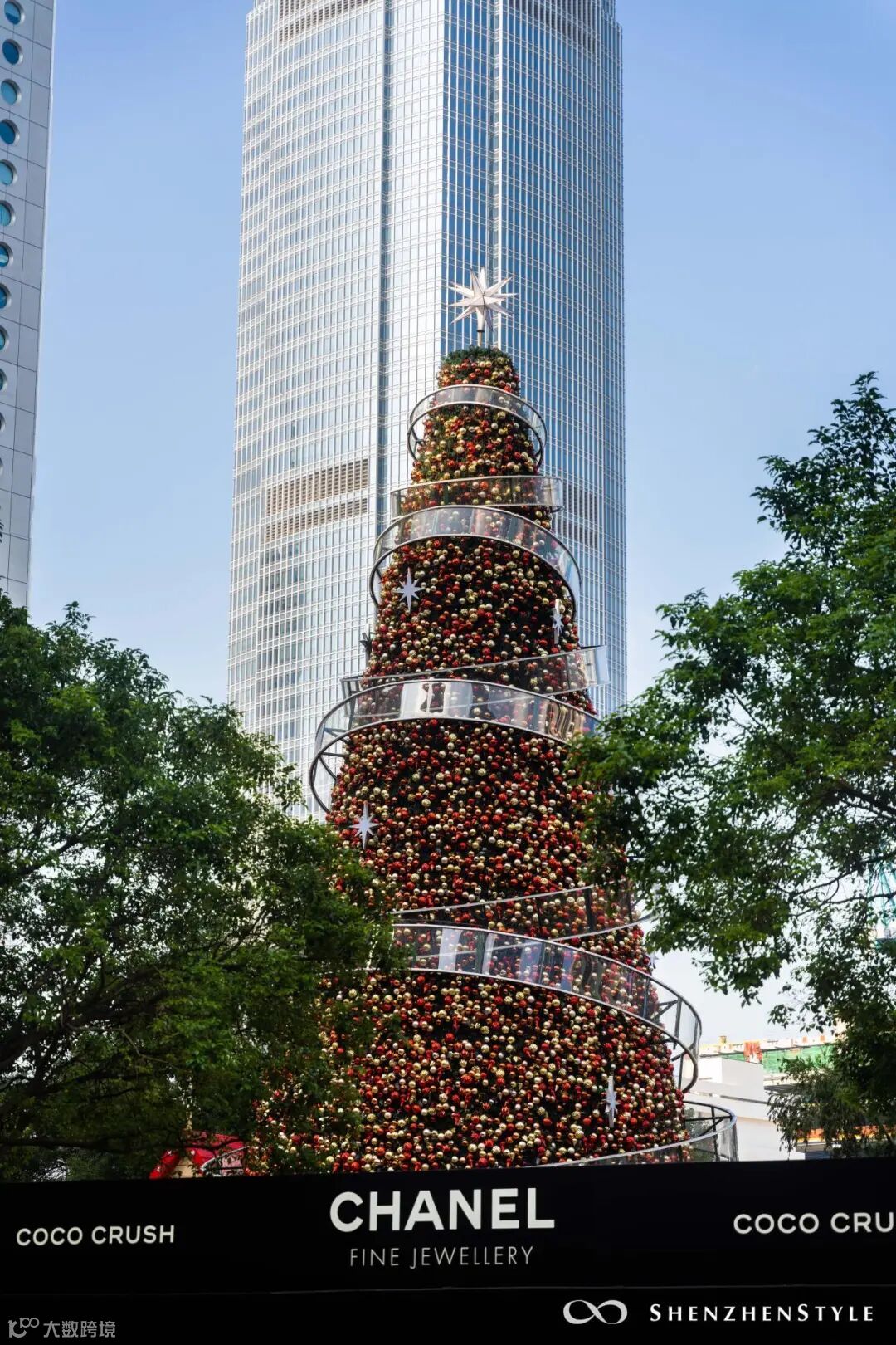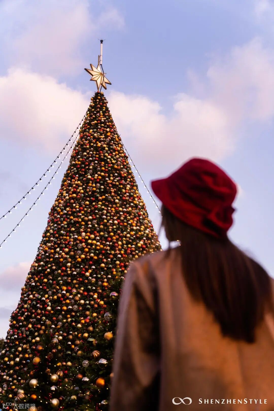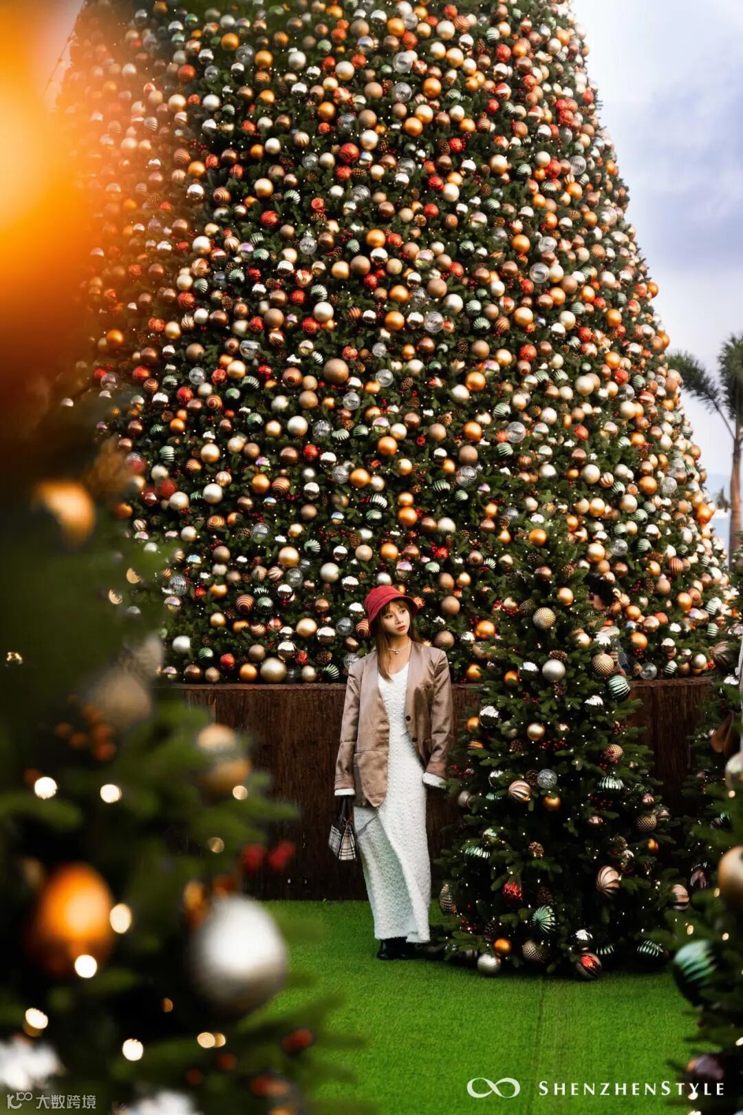 超巨型圣诞树装置,白天拍是时尚都市感,夜晚则梦幻感满满。