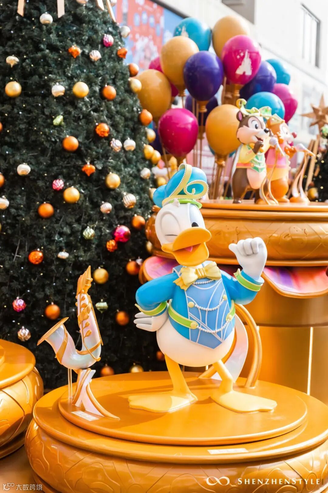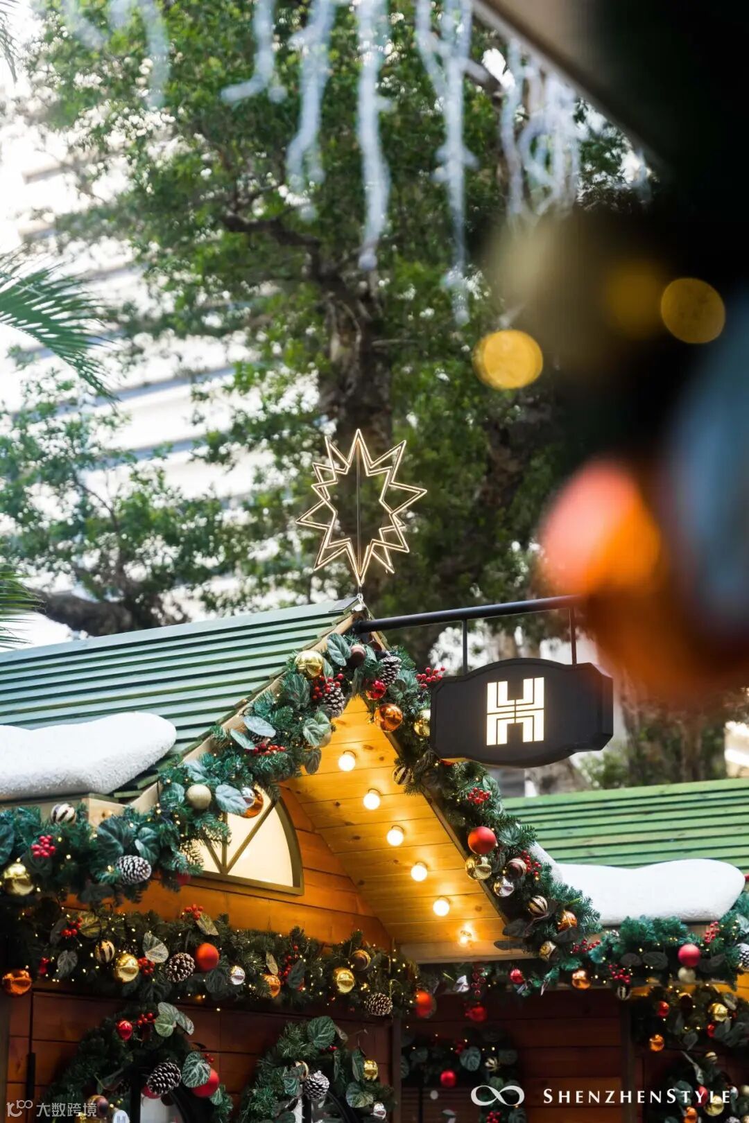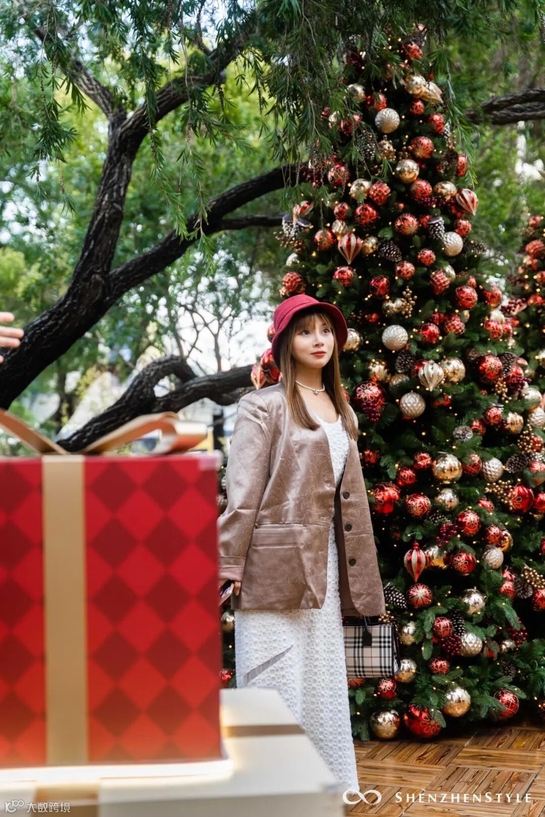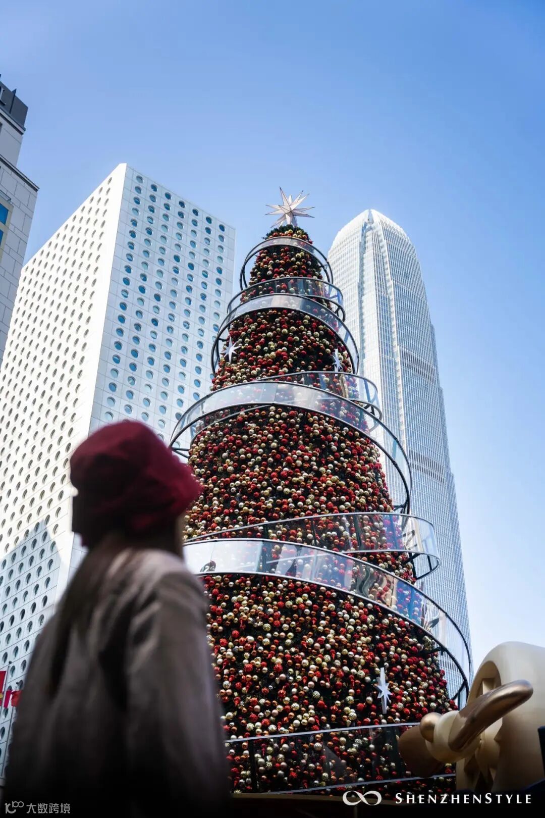 超巨型圣诞树装置,白天拍是时尚都市感,夜晚则梦幻感满满。