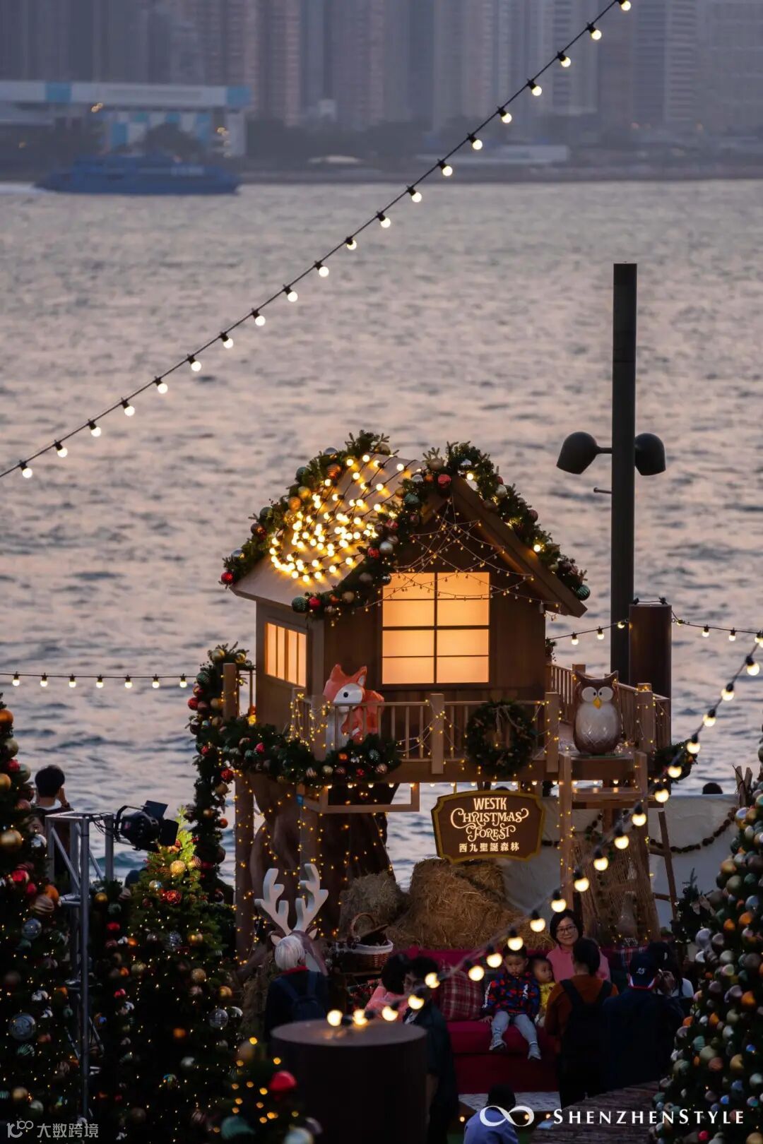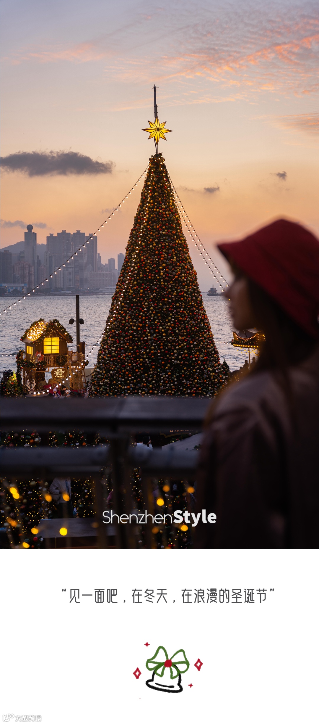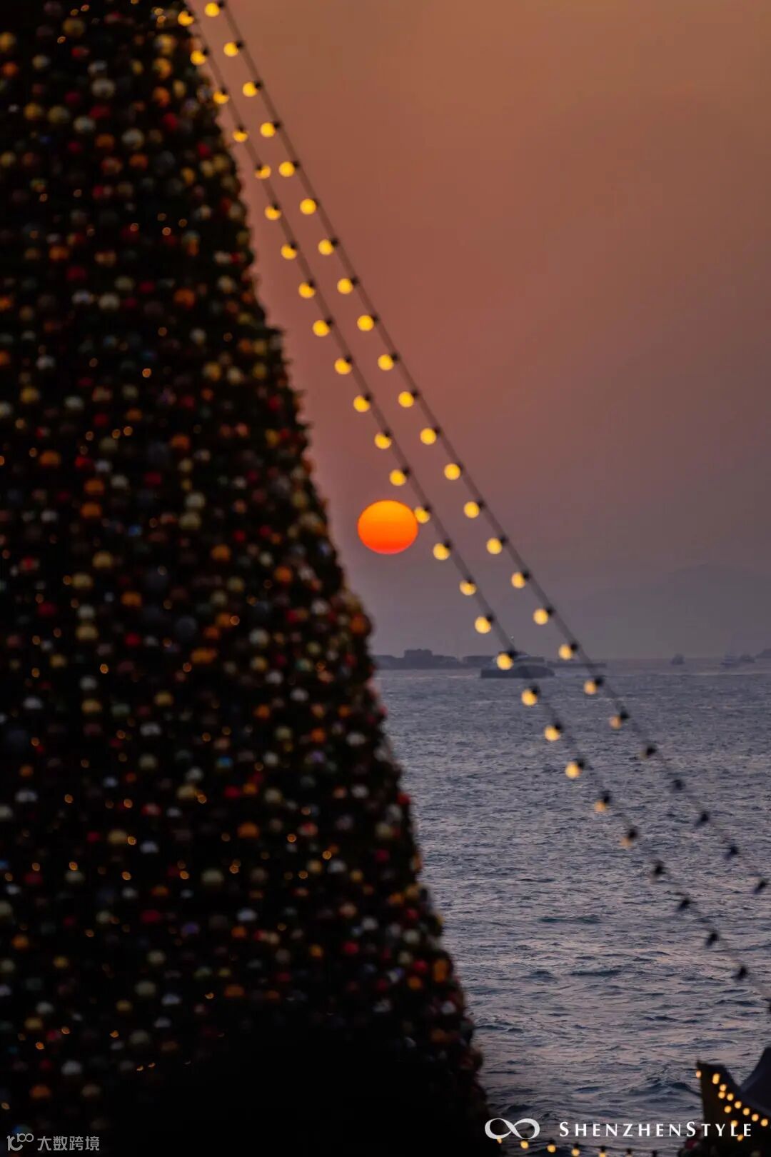 天色将暗未暗时,灯光闪烁亮起。海岸线的“咸蛋黄”与璀璨的圣诞灯光交相辉映,圣诞节的浪漫在此刻具像化。