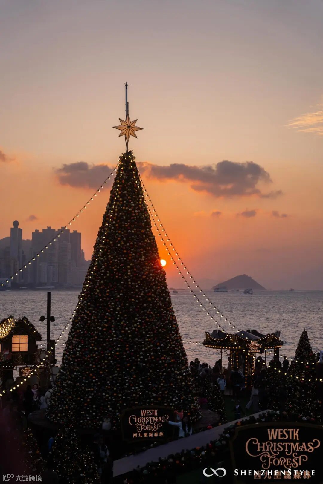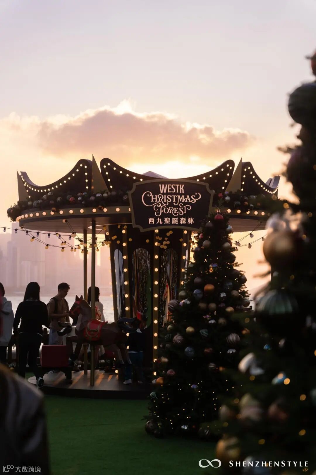 除了俯瞰日落,还可以钻进“西九圣诞森林”里,看黄昏下的旋转木马,站在大圣诞树下来一张打卡照。