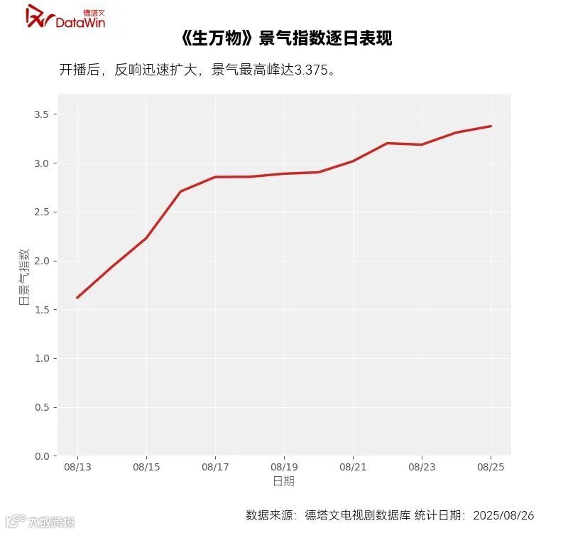 剧集开播时,市场由已播出过半的《凡人修仙传》与《锦月如歌》主导。《生万物》起势迅猛,开播第三天(8月15日)即反超《凡人修仙传》,登顶日榜,并持续领跑。