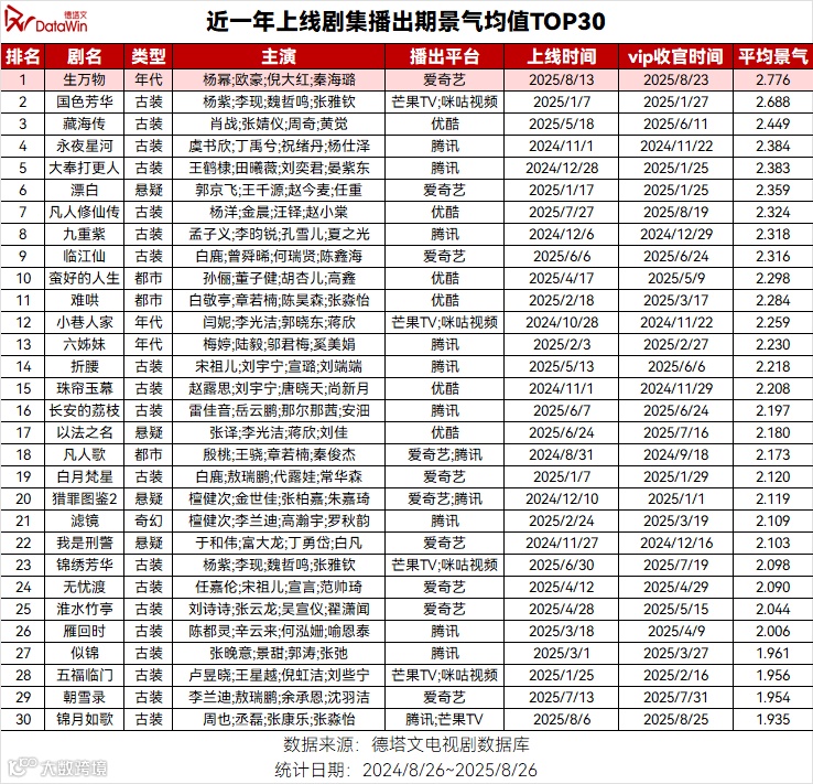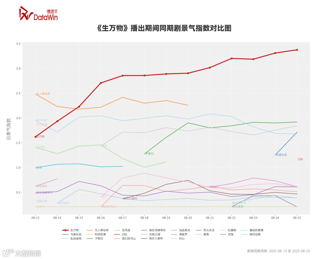 尽管《献鱼》(8月16日)、《子夜归》(8月18日)等多部古装剧陆续上线,均未能动摇《生万物》的领先地位,始终稳居市场榜首。