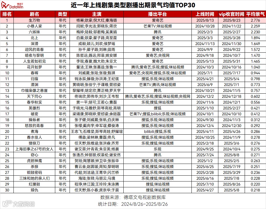 《生万物》凭借女性视角年代题材与主演杨幂的市场号召力,在2025年暑期档实现差异化突围。播出期平均景气指数高达2.776,位居近一年上线剧集首位,同时在年代剧中大幅领先《小巷人家》(2.259)和《六姊妹》(2.230),确立年度头部地位。