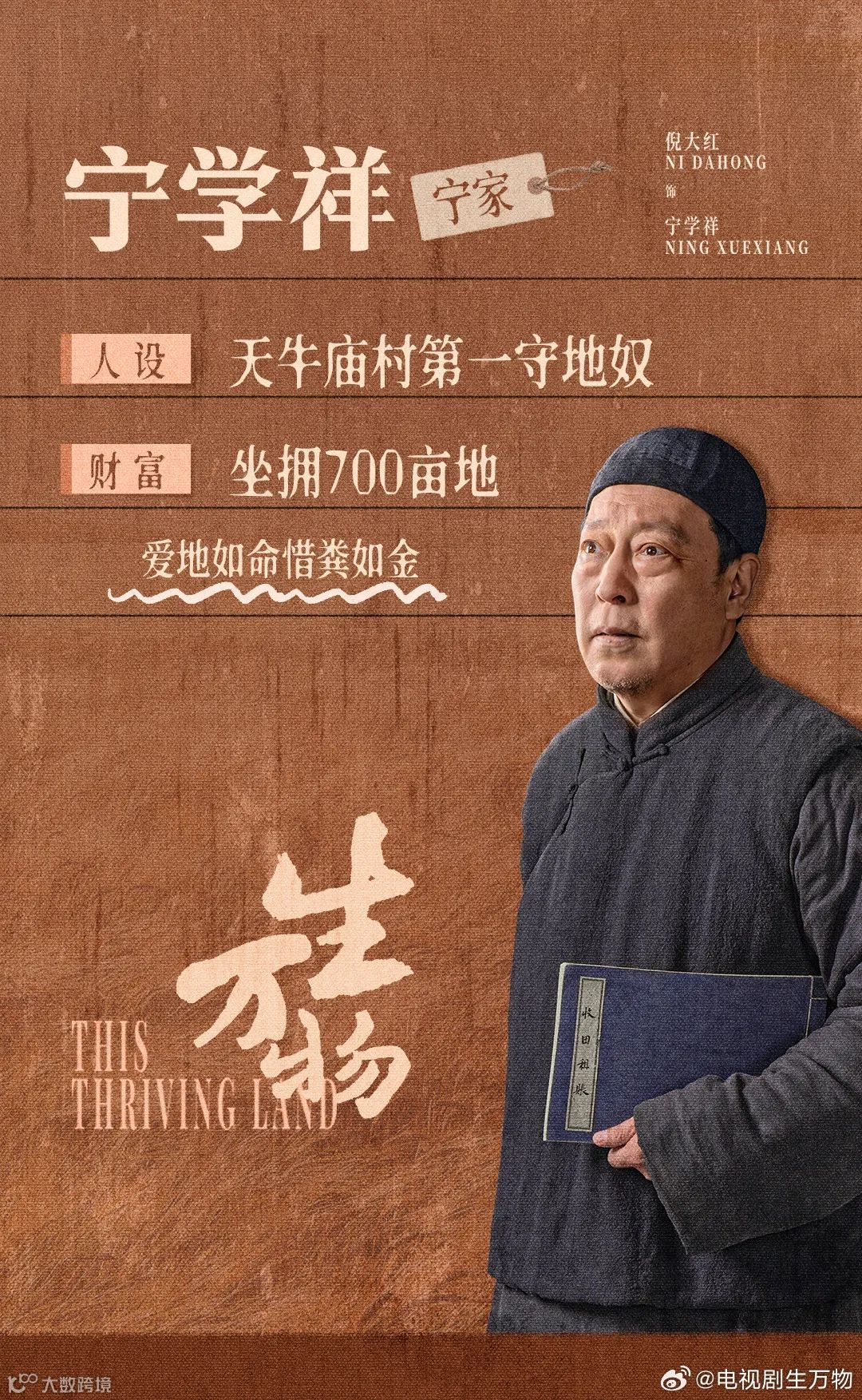 观众称其“地主”、“抠爹”、“苏大强2.0”。其功能为“矛盾源头”与“批判对象”:代表宁绣绣反抗的父权象征,集中体现封建地主阶级自私、冷酷、重男轻女弊病;“老夫少妻”猎奇设定增添话题度。