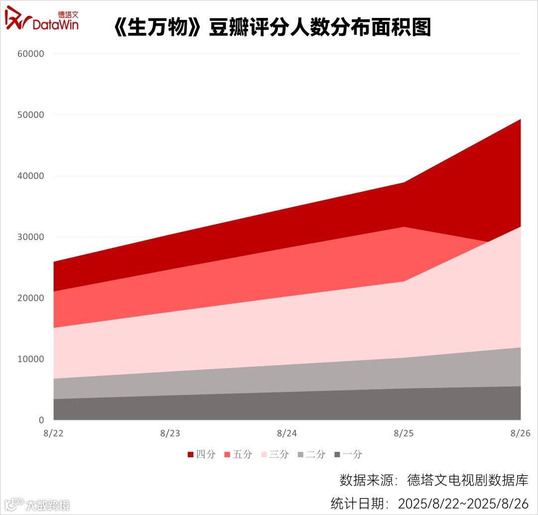“路人盘”入场信号:在8月26日,新增评分人数激增,3星(中立)与4星(正面)新增面积显著扩大,5星占比回落。表明剧集成功破圈,吸引更广泛普通观众评价,他们对悲剧结局更敏感,导致中性与较低正面评价增多,拉低整体评分。