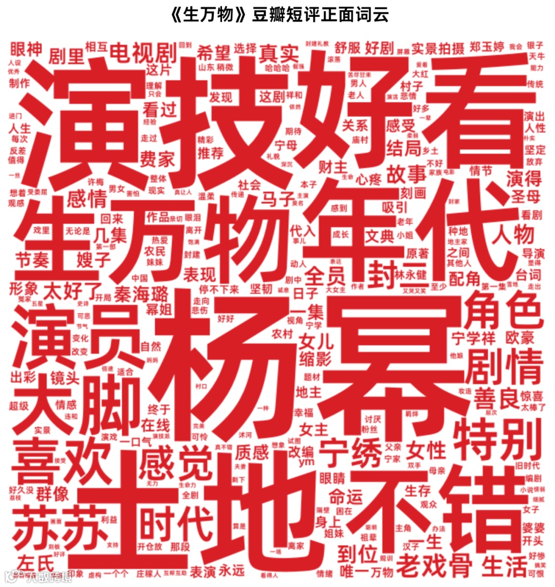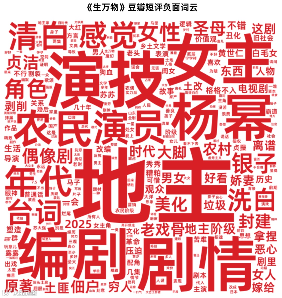 负面高频词为“地主”、“洗白”、“演技”(指向个别演员,尤指杨幂部分表现)、“圣母”,显示差评具靶向性,集中于价值观争议与主角人设后期争议。总体看,观众肯定剧集作为年代剧的完成度,但对其部分叙事立场与价值导向提出尖锐批评。该结构也解释了其稳定在7.3分的原因:好评基本盘稳固,争议点突出限制口碑进一步提升。