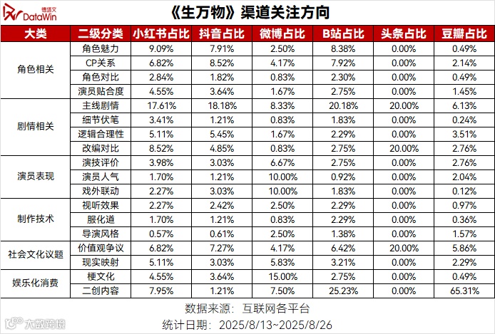 《生万物》于爱奇艺独播,主要竞品分散于优酷(《凡人修仙传》《献鱼》)与腾讯视频(《锦月如歌》《子夜归》《利剑玫瑰》)。爱奇艺凭此一部“剧王”占据暑期档后半程优势,精准吸引寻求差异化内容的观众;而对手虽以古装剧矩阵应对,但在热度上被全面压制。