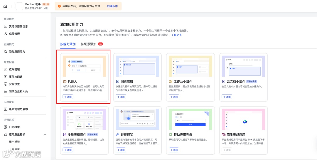 - 在左侧导航栏点击“添加应用能力”,选择“机器人”并添加
