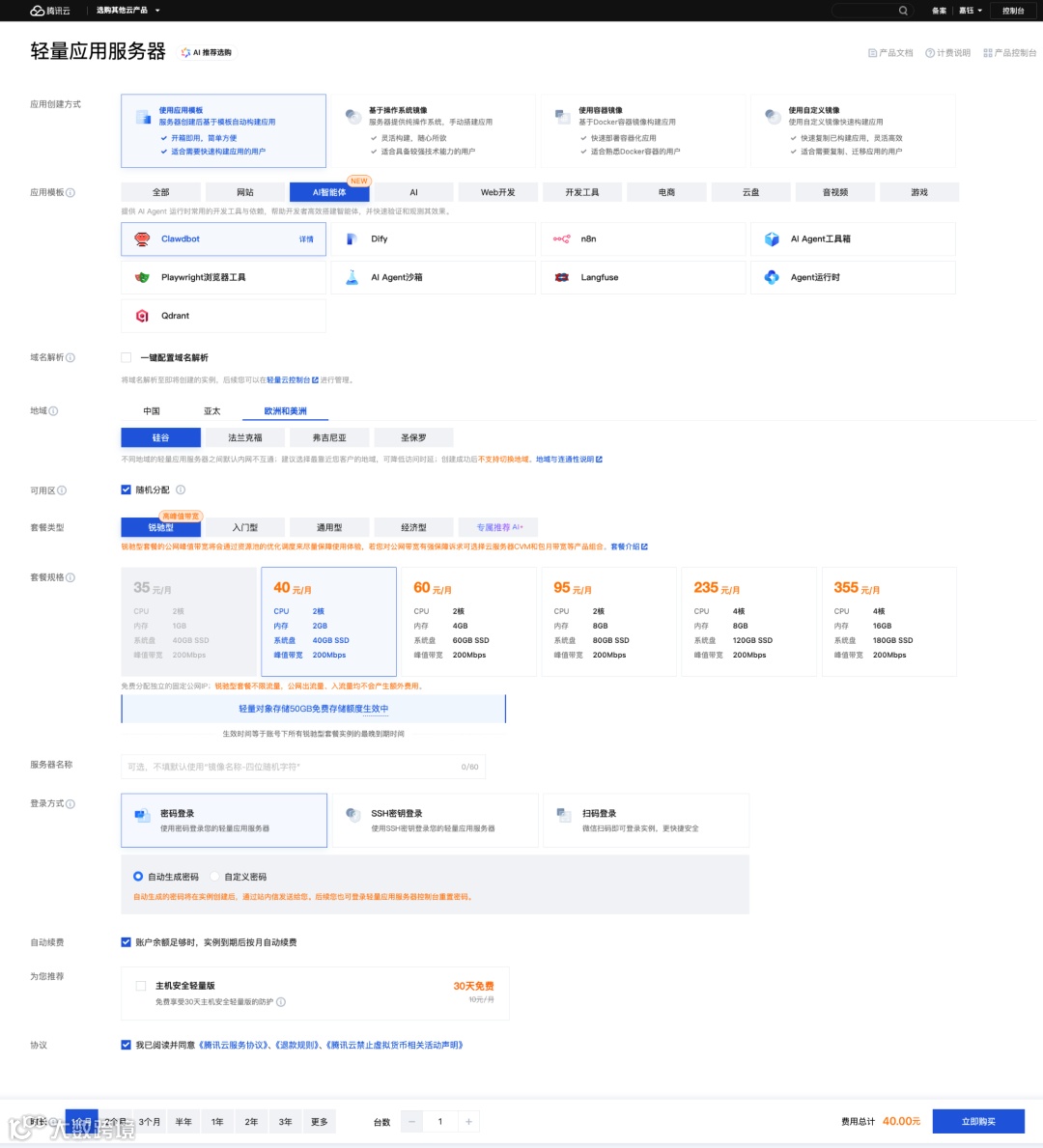 - 进入购买页,选择“应用模板” > “AI 智能体” > “moltbot”