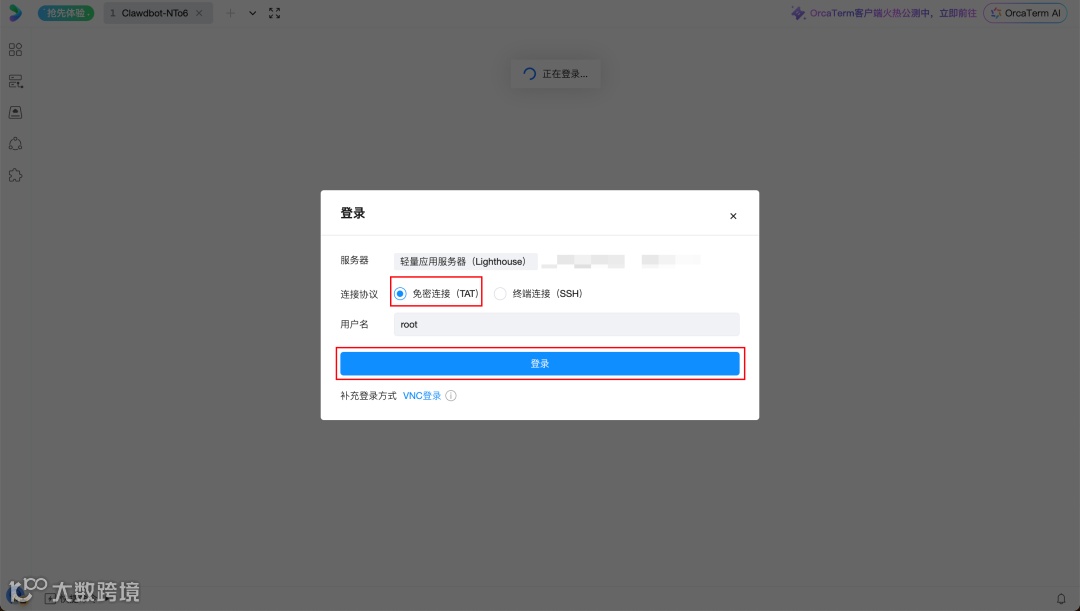 - 使用 OrcaTerm 工具选择“免密连接”登录