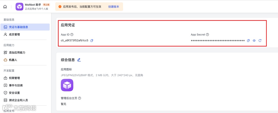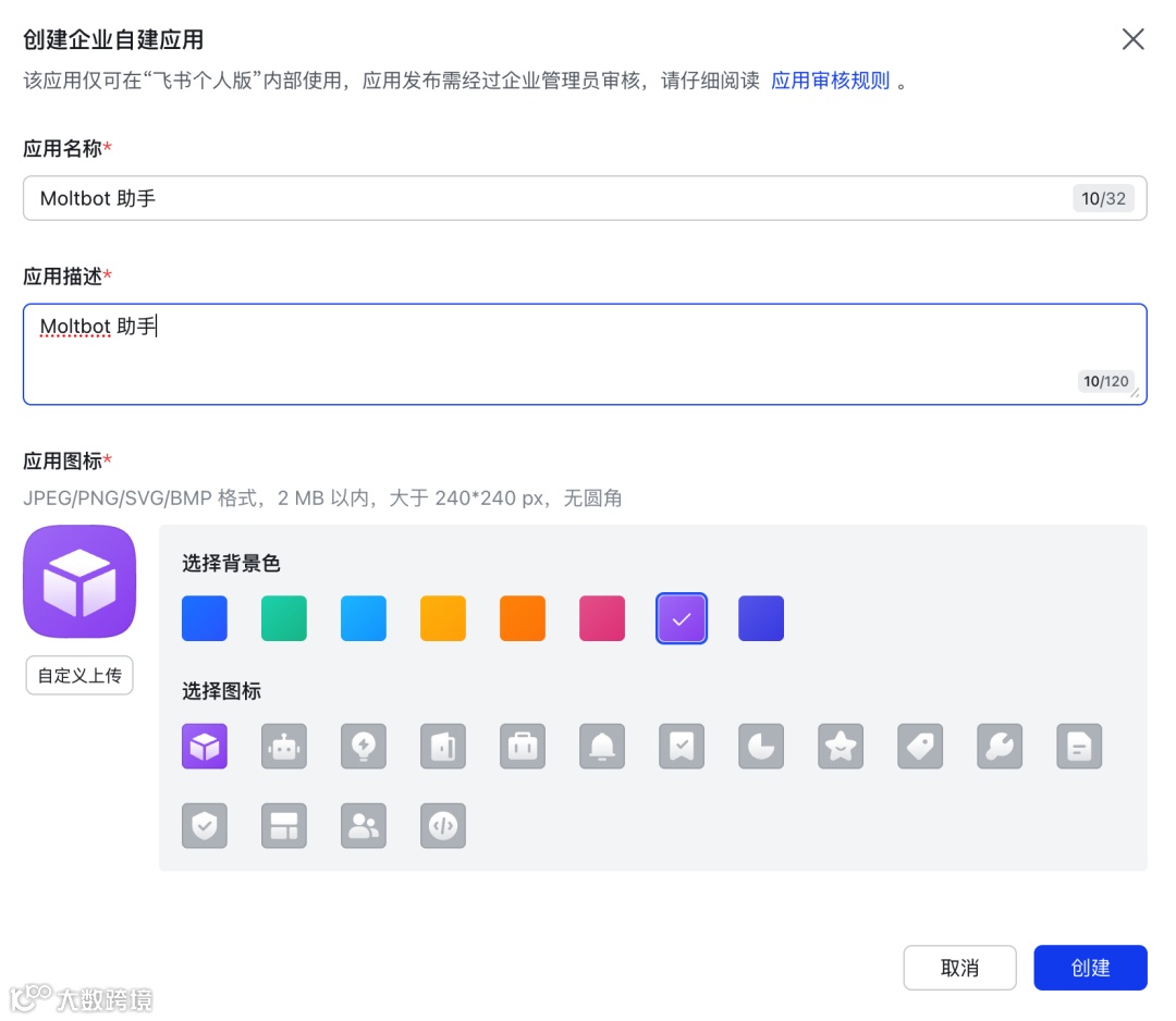 - 填写应用名称(如“Moltbot 助手”),上传图标,点击“创建”