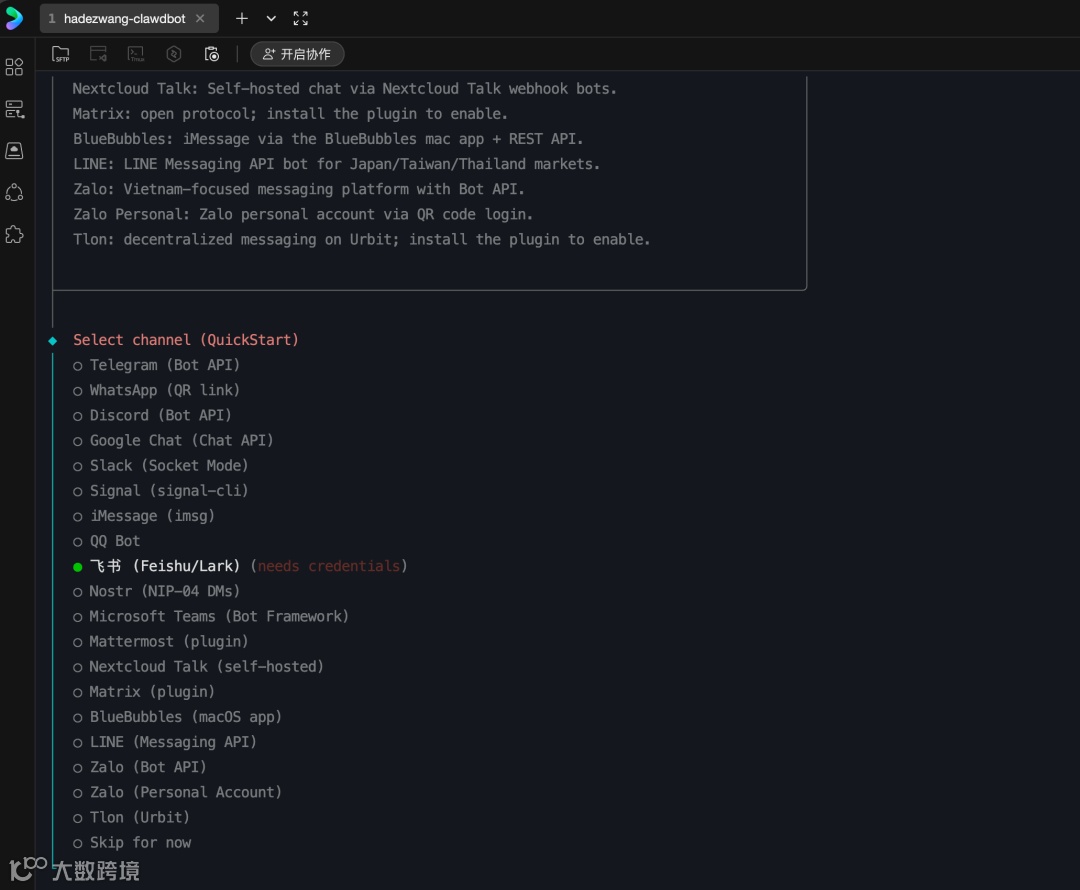 当前版本 onboard 流程不显示飞书选项,请跳过此步,后续单独添加。